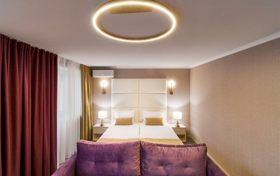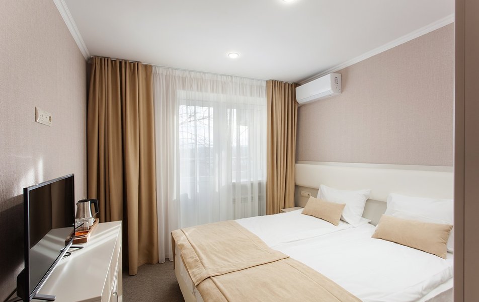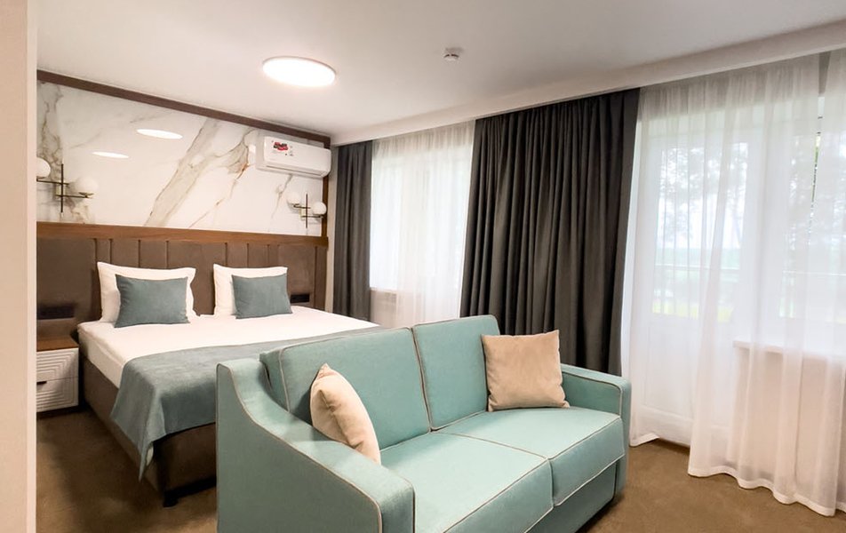 Спальный корпус соединен с лечебным корпусом теплым переходом. В санатории 95 номеров на выбор: одноместные, двухместные повышенной комфортности и апартаменты класса люкс. Все номера оснащены мебелью, телевизором и холодильником. Переход оборудован зоной отдыха.